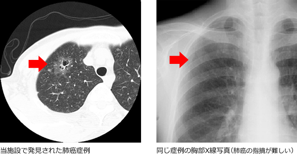 最新のヘリカルCT装置により、胸部の全領域を7mm暑さの横断画像(体の輪切りにした像)で表し、肺がんなどの異常を早期に発見することができます。
